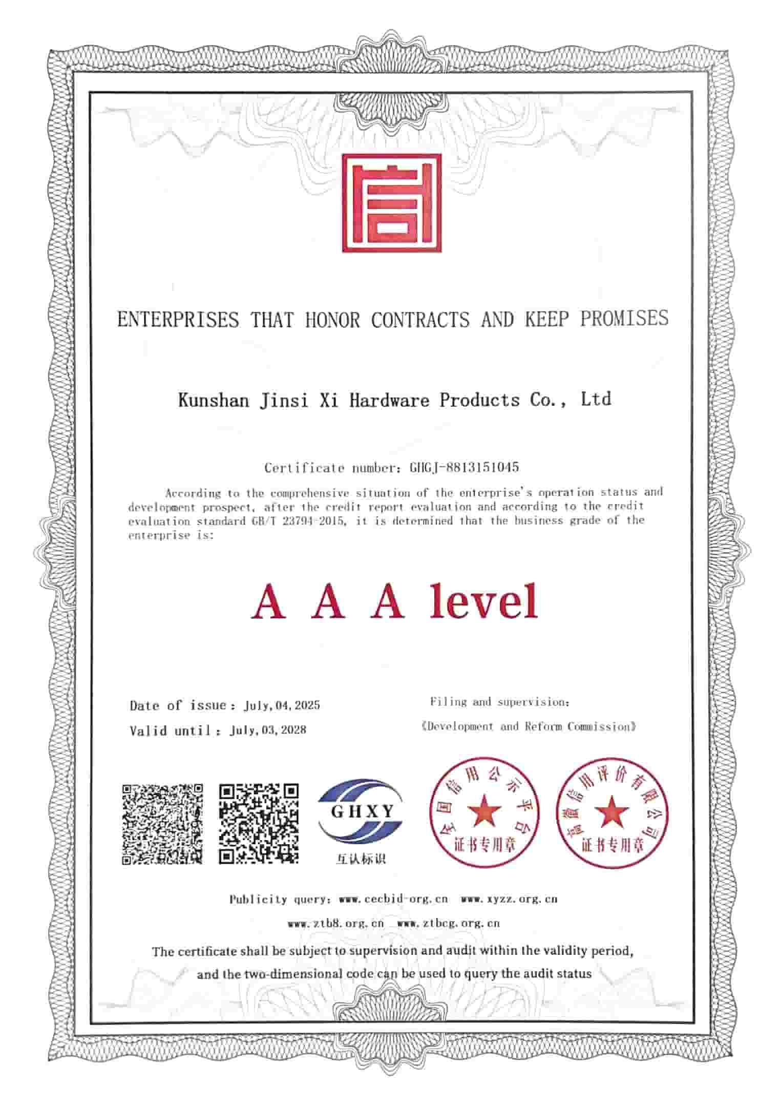 KunşanJinxiMetalware Co, Ltd. "Müqaviləni və vədləri qoruyan AAA səviyyəli müəssisələri" adlı rəsmi olaraq mükafatlandırıldı. Cinsixi, həmişə "birlik və əməkdaşlıq, əməkdaşlıq, mükəmməllik, mükəmməllik və kamilliyin ardınca" işgüzar fəlsəfəsinə, bütövlüyə, yüksək keyfiyyətli xidmətlər göstərən müştərilərə və nəticədə "mükəmməl yerinə yetirməyə" nail olmaq üçün "birlik və əməkdaşlıq, mükəmməllik və kamillik" nin iş fəlsəfəsinə riayət edir.